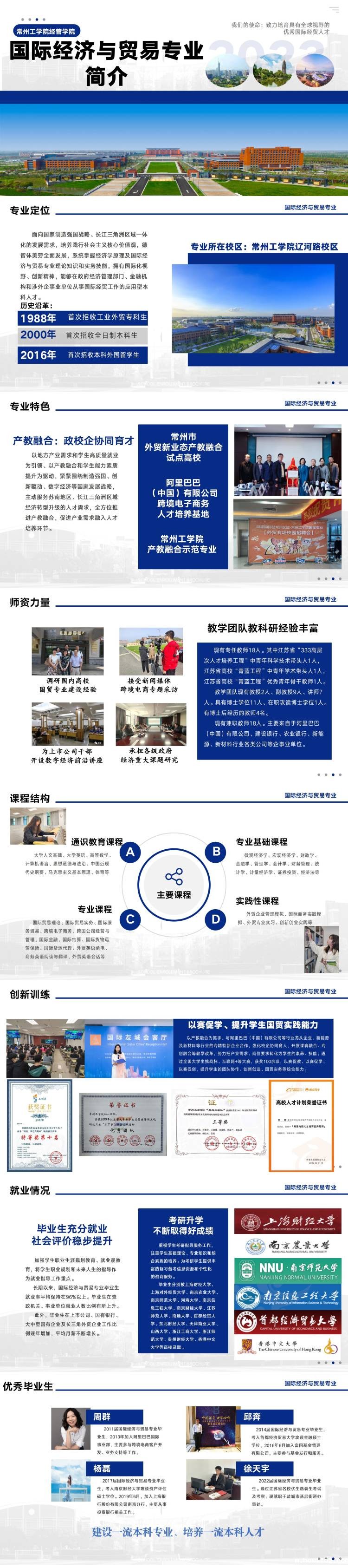 本专业面向国家制造强国战略及长江三角洲区域一体化发展需求,培养践行社会主义核心价值观,具有良好思想品质和道德修养,系统掌握经济学原理及国际经济与贸易专业知识和实践技能,熟悉管理、法律等方面知识与技能,熟练使用英语和运用现代信息技术,具有一定的科学思维,人文素质、职业道德、团队精神、创新精神以及终身学习意识和国际视野,能从事国际经贸业务及相关管理、研究和实践工作的应用型人才。