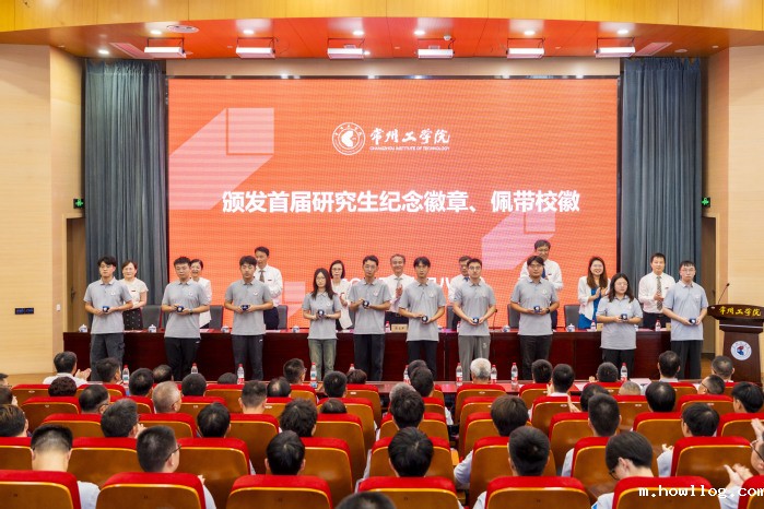 在庄重而温馨的仪式环节中,校领导为研究生新生代表颁发首届研究生纪念徽章并佩戴校徽。接过镌刻着个人姓名的专属纪念徽章和校徽,这不仅是身份的转变,更承载着学校的殷切期望与重托。同学们轻轻抚摸着手中的徽章,将胸前的校徽端正佩戴,脸上洋溢着自豪与激动的神情。